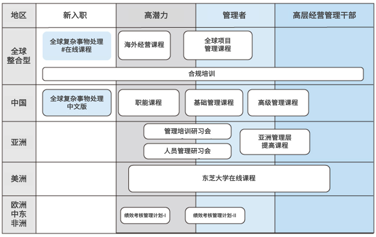 | 階段性培訓 | 面向被任命新職務(wù)(領(lǐng)導、管理人員等)的員工提供階段性培訓,目的是學(xué)習擔任新職務(wù)所需的基礎知識和技能,提高相應管理能力。此外,還包括持續提高主管人員管理能力的培訓、幫助員工提前掌握國際業(yè)務(wù)所需的知識和技能的教育培訓。 |